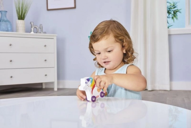 Il giocattolo è dotato di quattro ruote funzionali che consentono una manipolazione e un movimento semplici. Ideale per sviluppare la motricità grossa e l’immaginazione dei bambini già dai 12 mesi.