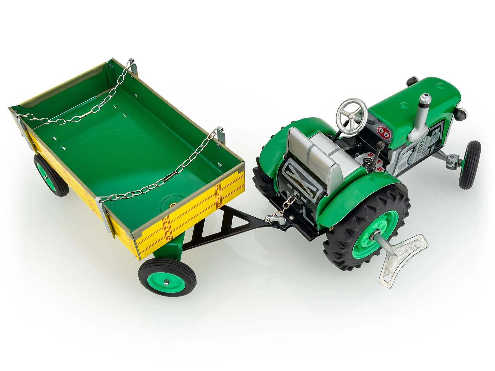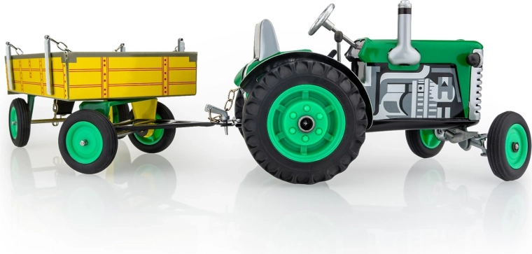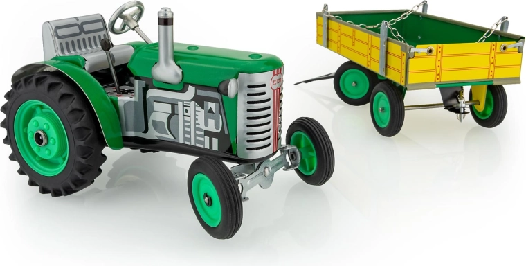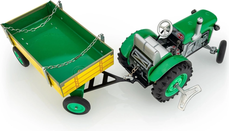 Il trattore Zetor in metallo con rimorchio del marchio KOVAP entusiasmerà piccoli e grandi appassionati di macchine agricole. La trazione è assicurata da un meccanismo a molla con chiavetta, non manca un cambio funzionante con 3 marce avanti e retromarcia, sterzo a volante e freno a mano. In scala 1:25 e con una lunghezza di 28 cm, offre un’esperienza di guida autentica e valore da collezione.