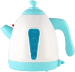 La teiera è progettata come un vero elettrodomestico da cucina con un elegante design bianco e turchese.