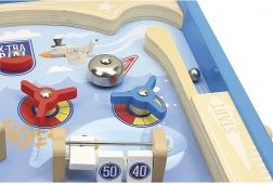Il solido telaio in legno, le leve (flipper), i tornelli, il campanello e i bersagli creano un’autentica esperienza da flipper a casa sul tavolo. Le gambe pieghevoli consentono un facile riponimento e trasporto, oltre alla regolazione della giusta inclinazione per una corsa vivace delle biglie.