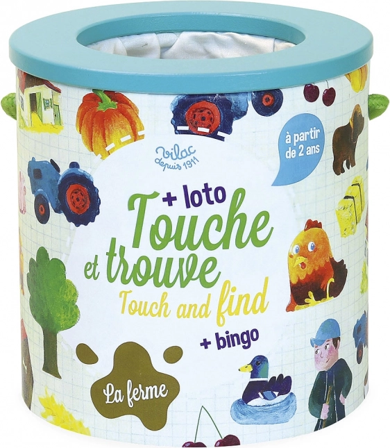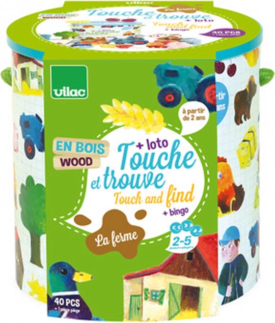Il gioco Vilac Tocca e trova - Fattoria è ideale per sviluppare le abilità motorie fini e il tatto nei bambini. I giocatori devono indovinare, al tatto, gli oggetti all'interno del secchiello. Per i bambini più grandi il gioco offre una variante di Loto o Bingo con le carte illustrate incluse.