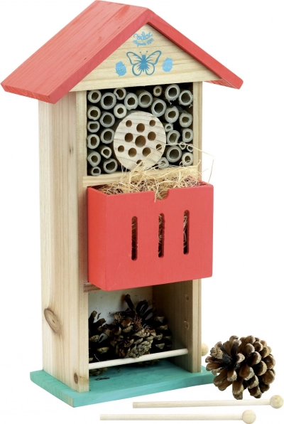 Grazie ai tetti decorativi rossi e all’aspetto naturale, questo hotel per insetti è un elemento estetico per qualsiasi giardino.