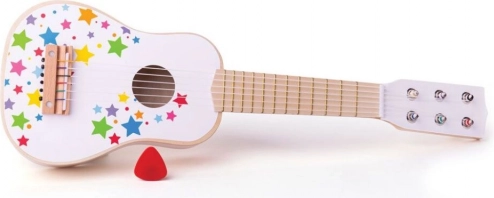 La chitarra è realizzata in legno spesso e resistente e soddisfa le attuali norme di sicurezza europee. La grafica a stelline colpisce a prima vista e motiva i bambini a esibirsi per famiglia e amici. Suonare la chitarra sviluppa senso del ritmo, percezione sensoriale, destrezza e creatività.
