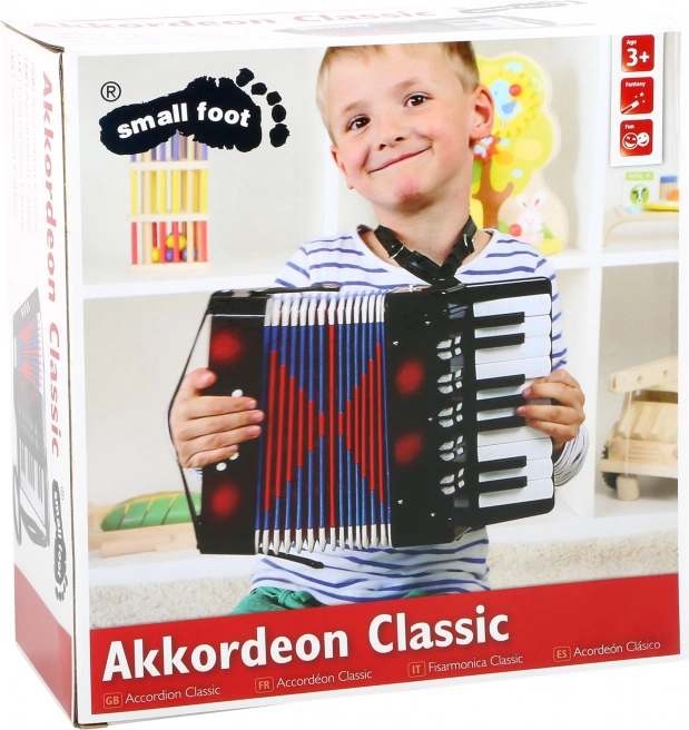 La fisarmonica per bambini small foot Classic porta in cameretta la gioia di scoprire suoni e ritmi. Il corpo in plastica leggera, le dimensioni compatte e le comode bretelle consentono ai bambini di suonare in piedi o seduti senza affaticare le braccia. I mantici colorati e la finitura lucida catturano l’attenzione a prima vista.