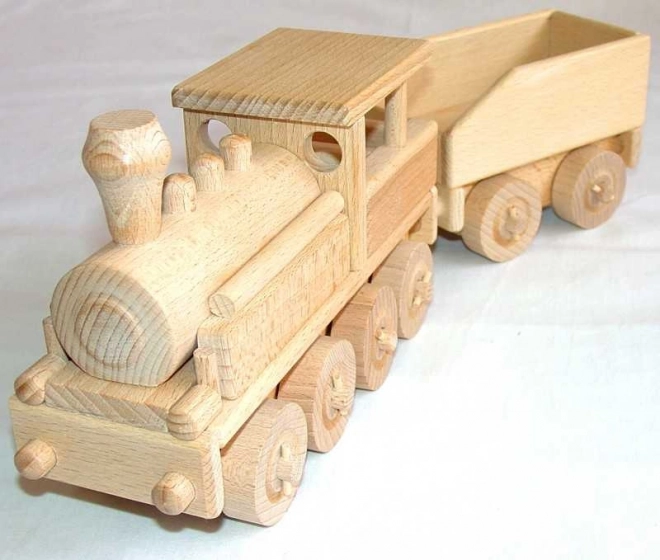 Questo modello in legno di locomotiva a vapore colpisce per la lavorazione precisa del legno di faggio e il design naturale accentuato solo dalla ceratura e lucidatura. La locomotiva ha ruote mobili ed è progettata senza bordi taglienti, garantendo un gioco sicuro per i bambini. Pertanto, è adatta non solo per giocare in casa ma anche in sabbiera.