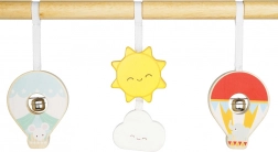 Questa stabile e sicura palestra per bambini è creata con legno di alta qualità tenendo conto della sicurezza dei bambini. Giocattoli colorati a forma di nuvola, montagne e palloni aerostatici sono appesi a corde tessili e tintinnano delicatamente.