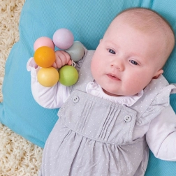 Il massaggiagengive Petilou di LE TOY VAN offre ai neonati un sollievo delicato durante la comparsa dei primi dentini e, allo stesso tempo, sviluppa motricità fine e sensi. Grazie alle perline di legno pastello infilate su un elastico, si afferra con facilità, è piacevole da tenere e invita a esplorare colori e forme.