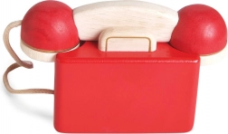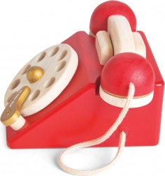 Elegante telefono in legno dallo stile vintage per piccoli birbanti. Realizzato in pregiato legno di caucciù, ha un quadrante rotante, una suoneria nella cornetta e vernici atossiche a base d'acqua. Sostiene lo sviluppo della motricità fine, la fantasia e l'apprendimento dei numeri – ideale per il gioco quotidiano.