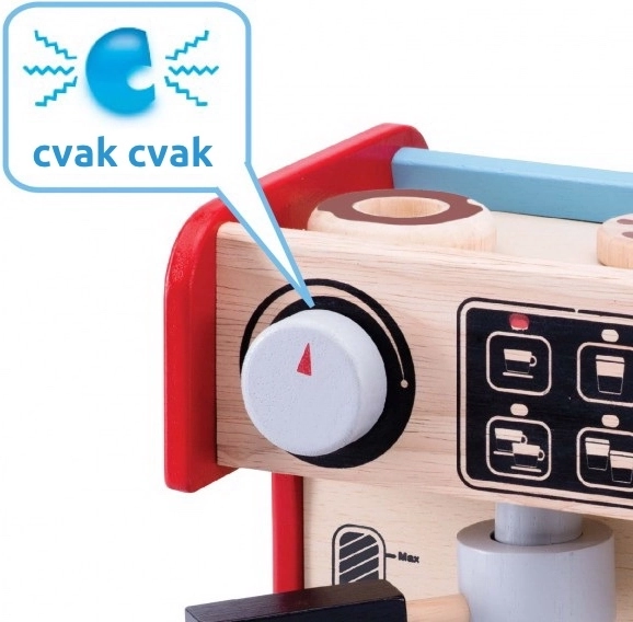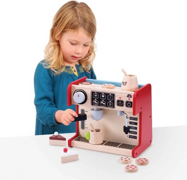 I bambini possono provare con questa macchina da caffè cosa significa essere un barista. Il kit include una macchina da caffè con leva rimovibile e dosatore di latte mobile. Tutto è completato da un display di controllo con un pulsante rotante che emette un clic e bottoni dipinti.