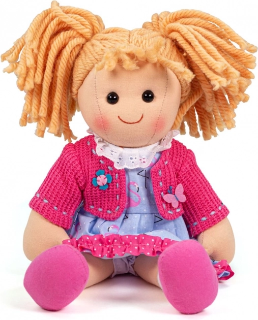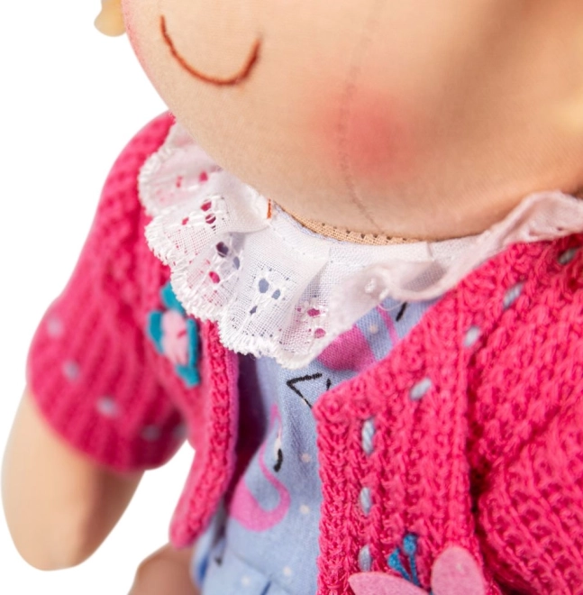 La bambola di stoffa Maggie è una dolce compagna per il gioco e le coccole di ogni giorno. Grazie al corpicino morbido privo di parti rigide è sicura anche per i neonati e il suo sorriso amichevole conquisterà i bambini al primo sguardo. L'outfit alla moda è composto da un cardigan rosa lavorato a maglia e da un abitino blu con motivo di fenicotteri, che stimola l'immaginazione nei giochi di ruolo.
