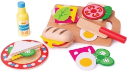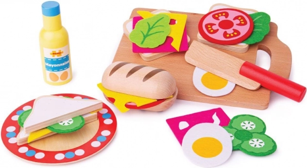 Nella confezione trovi tutto il necessario per preparare un gustoso sandwich: baguette, fette di pane, maionese, lattuga, cetriolo, formaggio, uovo e pomodoro, oltre a piatto, tagliere e coltello. I materiali provengono da fonti responsabili e il giocattolo rispetta le norme di sicurezza europee, per una scelta su cui puoi contare.