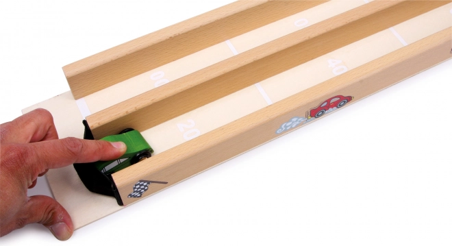 Questa elegante pista di gara in legno è un ottimo modo per coinvolgere i bambini in un gioco interattivo e divertente. Include due piste decorate con illustrazioni colorate, che offrono un'esperienza visiva e di gioco.