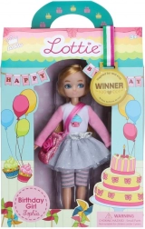 Lottie Birthday Girl Sophia porta la gioia del compleanno in ogni giorno. Indossa una maglietta rosa con stampa cupcake, gonna argento e leggings/shorts a righe, abbinati a sneakers argento e una scintillante borsetta rosa. La bambola ha ginocchia snodate, sta in piedi da sola e i suoi capelli in nylon premium sono morbidi e non si annodano.