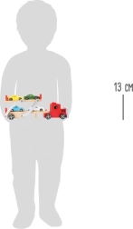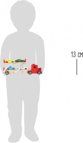 Attenzione, si carica! Questo robusto camion in legno con auto del marchio small foot trasporta fino a quattro macchinine sport contemporaneamente. Dispone di una piattaforma superiore mobile per un carico e scarico agevoli, di una sbarra di sicurezza anti-retromarcia e di una struttura resistente in legno e metallo – ideale per i piccoli appassionati di auto e per ogni pista delle macchinine.