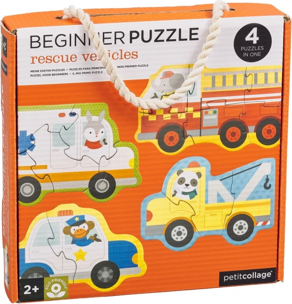 Un delizioso set di quattro puzzle con temi di veicoli di soccorso farà felici i piccoli costruttori dai 2 anni in su. Ogni mini puzzle ha un livello di difficoltà diverso (3–6 pezzi), così i bambini progrediscono passo dopo passo. Realizzato in cartone riciclato e stampato con inchiostri a base vegetale. Incluso un pratico box contenitore per un facile trasporto e riponimento.