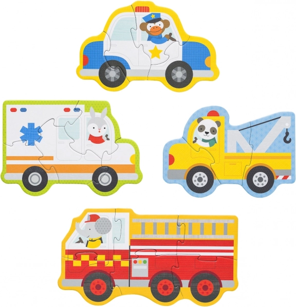 Fate conoscere ai bambini il mondo dei soccorritori con tenere illustrazioni – un coniglio guida l’ambulanza, una scimmia l’auto della polizia, un elefante il camion dei pompieri e un panda il carro attrezzi. Le diverse difficoltà dei puzzle (3, 4, 5 e 6 pezzi) favoriscono lo sviluppo graduale delle abilità, la pazienza e la gioia per i progressi.