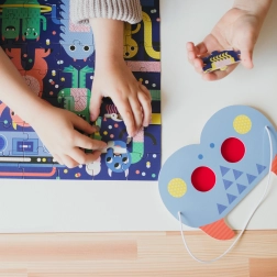 Dopo aver completato l’immagine li attende un’indagine da piccoli detective: riusciranno a trovare 5 dolcetti, 4 oggetti con ruote, 3 copricapi, 2 strumenti musicali e 1 cosa puzzolente? Grazie ai materiali di qualità in carta certificata FSC e alla stampa con inchiostri atossici, il gioco è sicuro e a basso impatto ambientale.