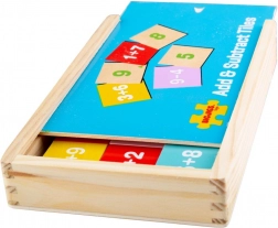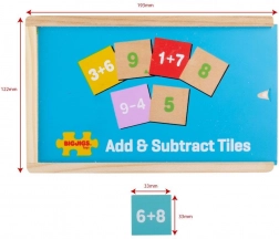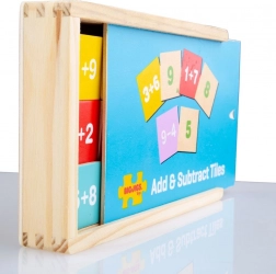 - Tasselli in legno multicolori per addizioni e sottrazioni con i numeri 1–9, riposti nella scatola