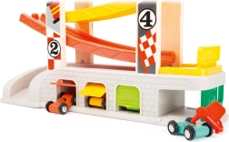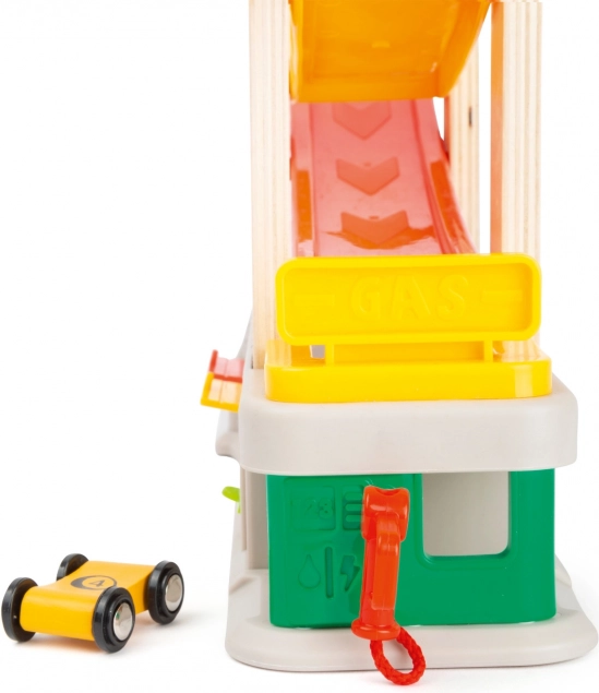 Presentiamo la pista da corsa che garantisce ore di divertimento per i tuoi bambini. Questo set include non solo la pista da corsa, ma anche tre garage e una stazione di rifornimento, permettendo di simulare diversi scenari di gioco. Grazie al suo colore unico la pista cattura facilmente l'attenzione e stimola la curiosità dei bambini. La struttura robusta combina pezzi in plastica e legno decorati in modo attraente, garantendo una lunga durata.