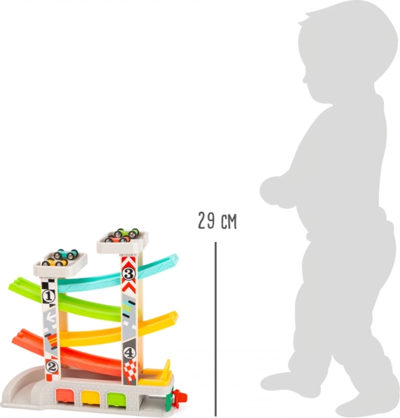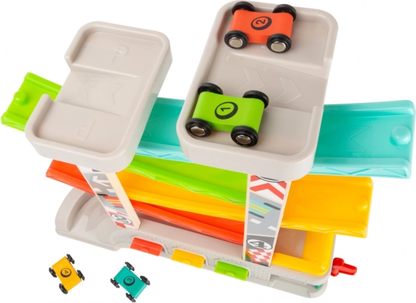 La pista da corsa include diversi livelli e macchinine colorate, garantendo un gioco divertente e educativo.