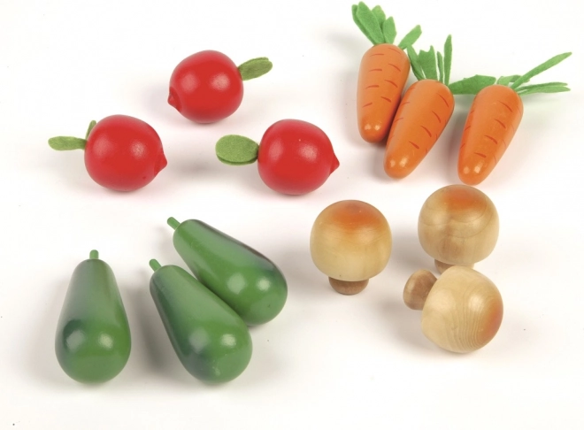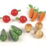 Il set comprende una selezione di verdure amate – carota, zucchina, pomodoro e funghi – riposte in una resistente cassetta di legno. Tutto è realizzato con cura in materiali di qualità e ottenuti responsabilmente, sicuri per il gioco dei bambini.