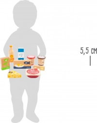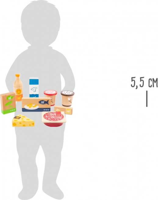 Il set comprende succo d’arancia, due confezioni di gelato, una confezione di piselli, bastoncini di pesce, burro, formaggio, salame affettato e una confezione di latte. Stampe realistiche e look naturale colpiscono a prima vista. Grazie al legno robusto, il set è resistente e pronto per il gioco quotidiano.