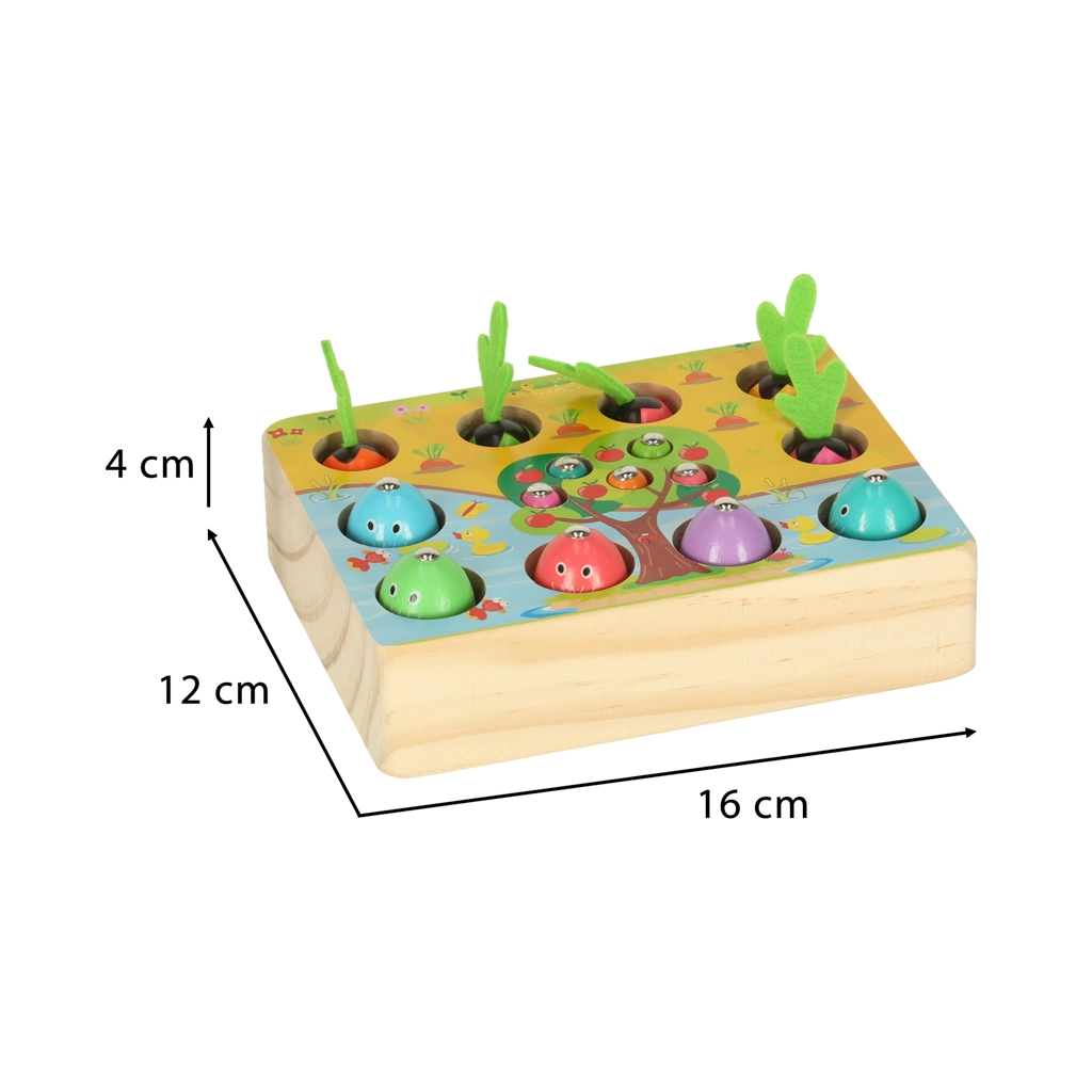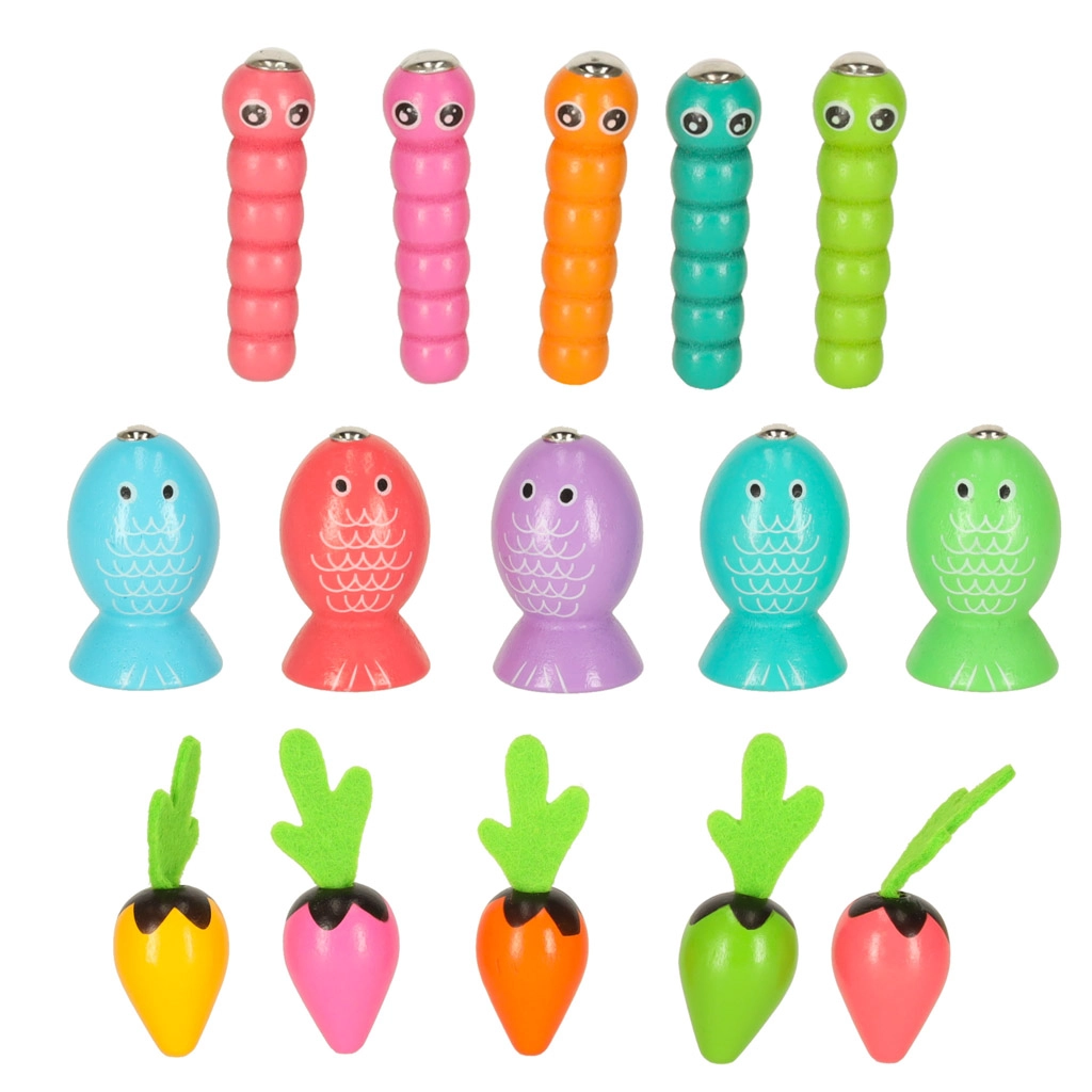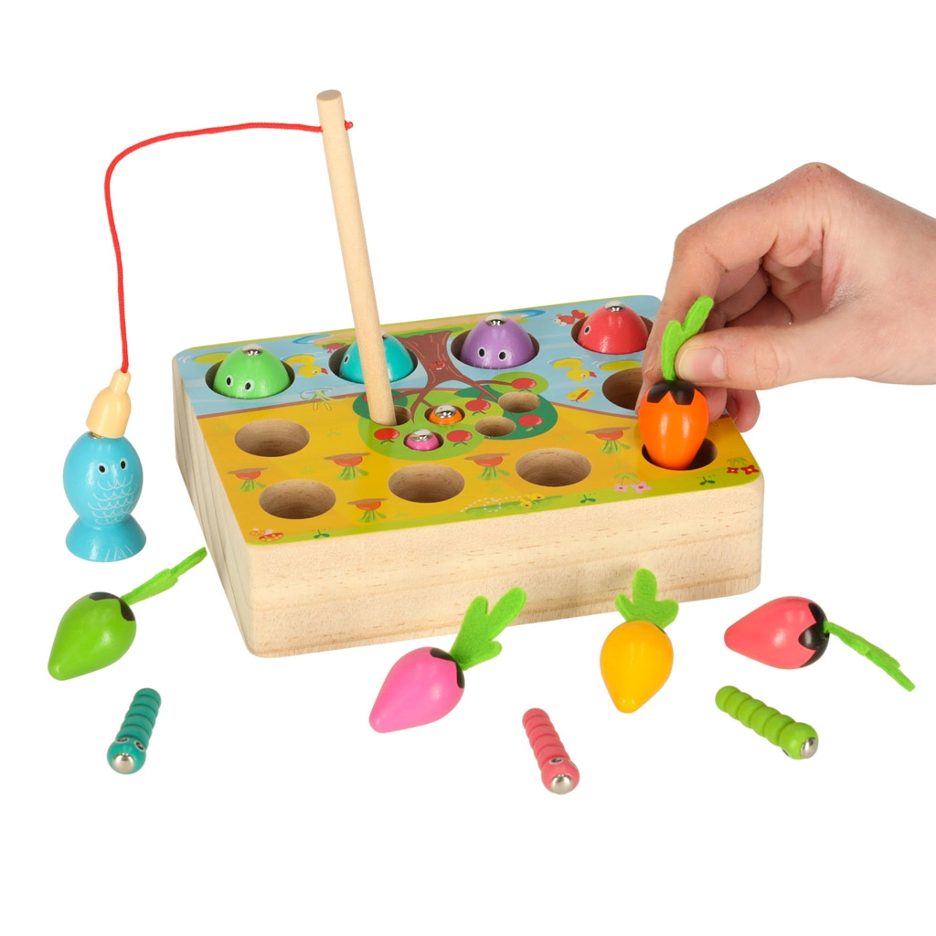 Questo set multifunzionale in legno porta i bambini allo stagno e nell’orto, direttamente a casa. Con la canna magnetica, i piccoli pescatori cattureranno pesciolini e vermetti dai fori dedicati, mentre i piccoli giardinieri raccoglieranno le carotine afferrandole dalle morbide foglioline in feltro. Il gioco sviluppa naturalmente concentrazione, precisione dei movimenti e insegna a distinguere i colori.