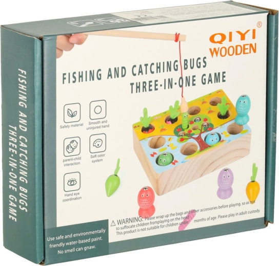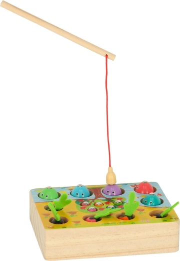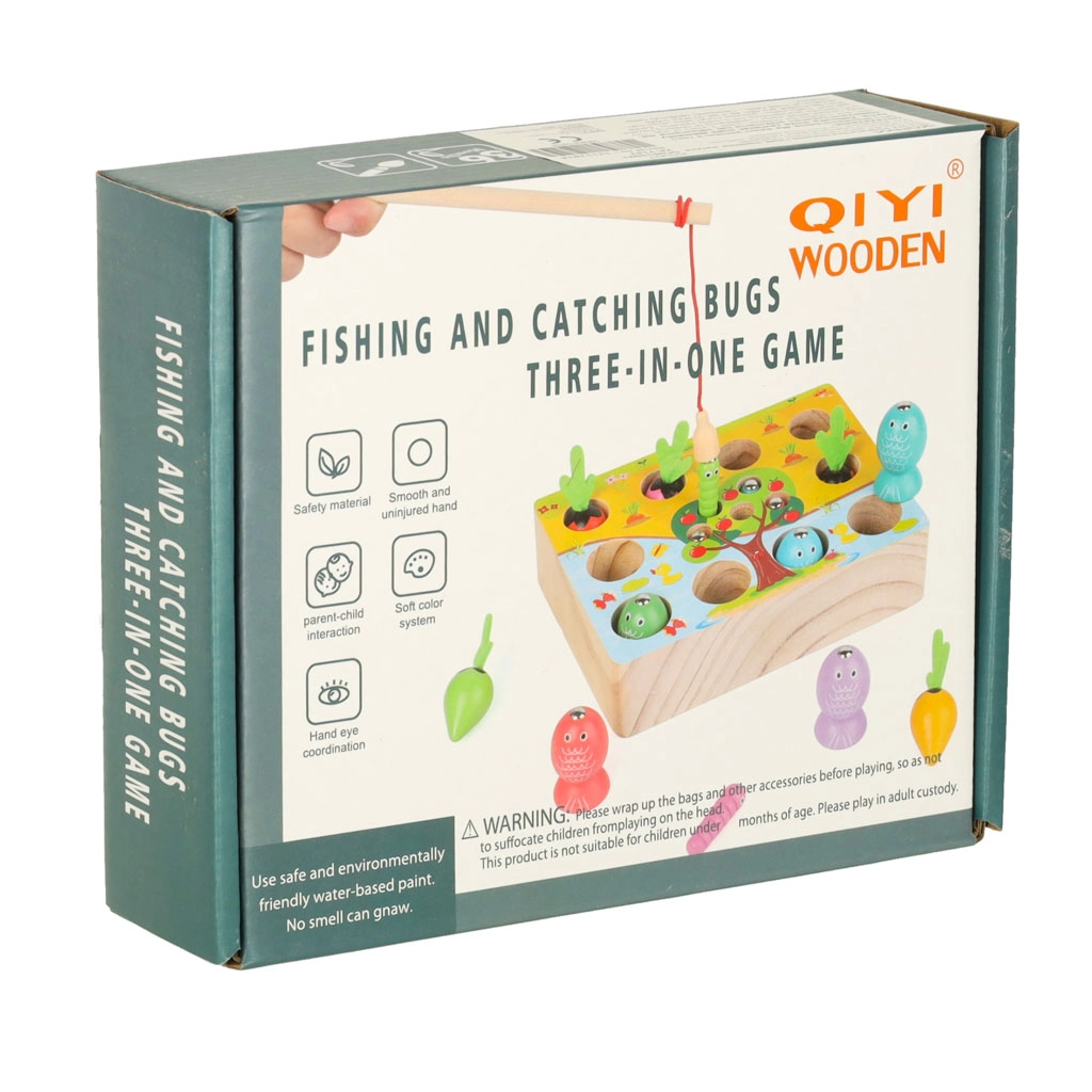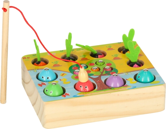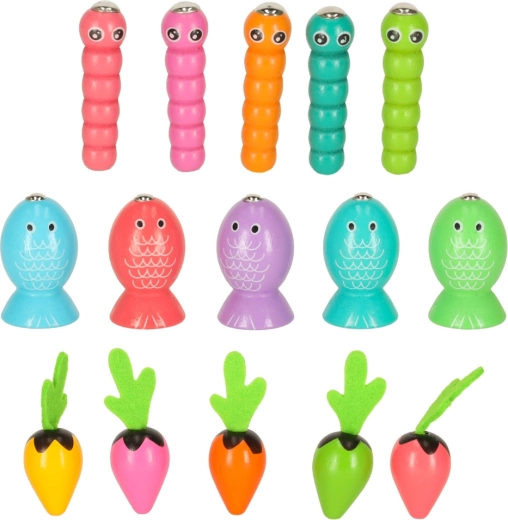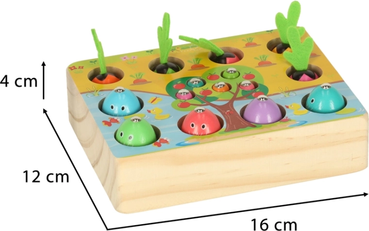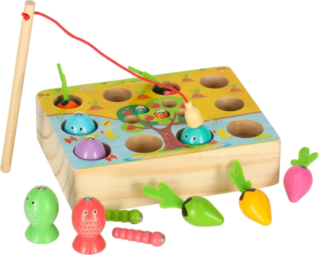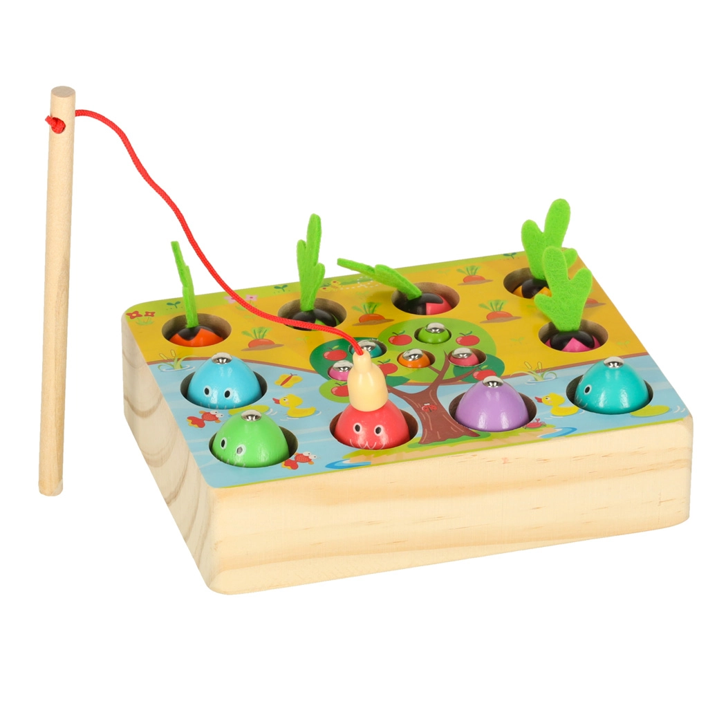Questo set multifunzionale in legno porta i bambini allo stagno e nell’orto, direttamente a casa. Con la canna magnetica, i piccoli pescatori cattureranno pesciolini e vermetti dai fori dedicati, mentre i piccoli giardinieri raccoglieranno le carotine afferrandole dalle morbide foglioline in feltro. Il gioco sviluppa naturalmente concentrazione, precisione dei movimenti e insegna a distinguere i colori.