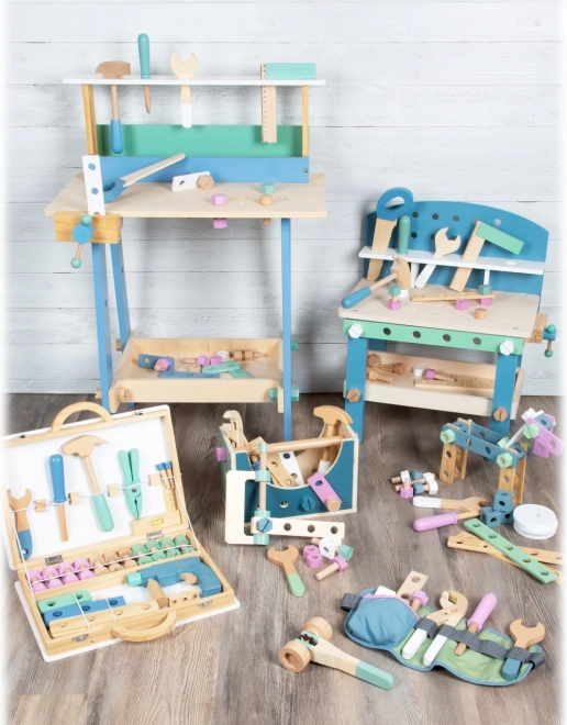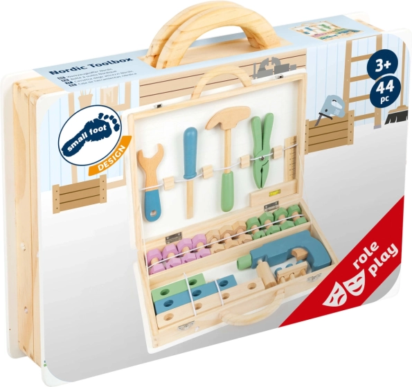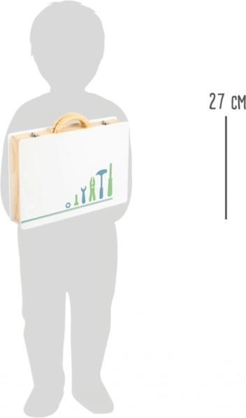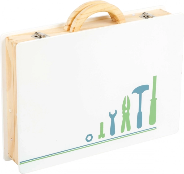 La chiusura in metallo affidabile e il manico adattato alle mani dei bambini garantiscono un trasporto facile. Il set è realizzato in una combinazione di compensato e legno massiccio, offrendo lunga durata e molti miglioramenti utili. I bambini possono scegliere tra diversi decori: Miniwob da officina e Nordic scandinavo.