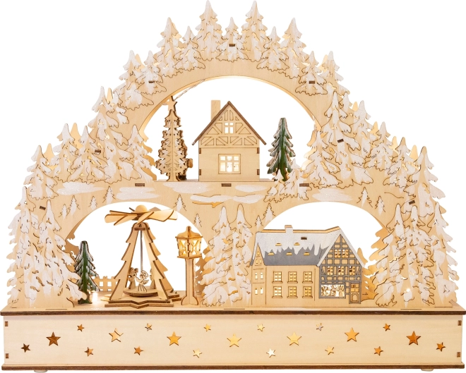 L'aspetto artigianale, i precisi intagli di alberi e casette e il tono naturale del legno fanno dell'arco un punto focale accattivante dell'addobbo natalizio, sia alla finestra che sulla credenza.