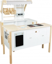 Scopri un mondo creativo con il nostro chiosco multifunzionale, progettato per la fantasia giocosa dei bambini. La sua struttura trasformabile consente una trasformazione rapida da chiosco di vendita a cucina o caffè. La multifunzionalità di questo chiosco include una bilancia, scaffali ribaltabili, lavagne per disegnare e perfino una macchina da caffè con spazio di stoccaggio contenente due cassette. Un ottimo accessorio è la tenda variabile che può essere facilmente piegata per risparmiare spazio.