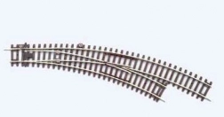 Deviatoio curvo Piko con una riproduzione dettagliata delle traversine in legno e colori veritieri. Questo deviatoio combina una coppia di curve a 30° R3 e R2 per una direzione destra ed è possibile controllarlo manualmente o tramite telecomando.