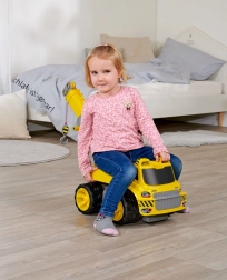 La guida confortevole è garantita da due pratiche maniglie sulla cabina, mentre la protezione anti-ribaltamento anteriore e posteriore aumenta la sicurezza durante la marcia. Gli assi in metallo e gli pneumatici morbidi che non lasciano segni garantiscono uno scorrimento fluido sui pavimenti interni e all’esterno al parco giochi o in giardino.