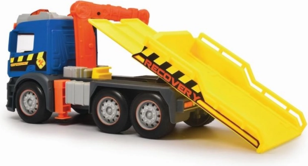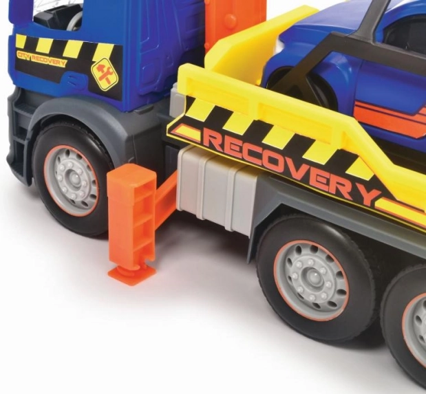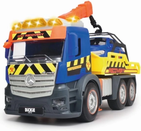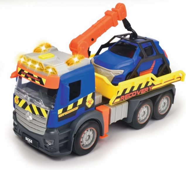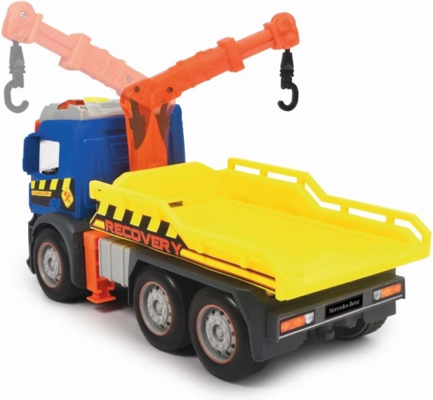 Scopri il realistico carro attrezzi MERCEDES lungo 26 cm con trazione a frizione, luci e suoni. Le finestre trasparenti rivelano i dettagli dell’abitacolo; il caricatore mobile e la piattaforma di carico ribaltabile assicurano un gioco ricco di azione. Inclusi anche un veicolo aggiuntivo da trainare e la funzione Try Me per provarlo subito.