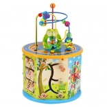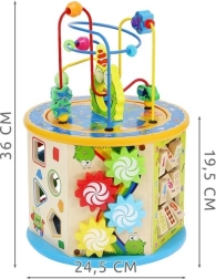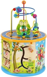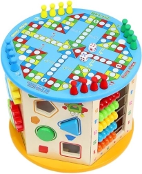 La parte superiore con il labirinto di perline è ideale per allenare la presa e la motricità fine, mentre i pannelli laterali offrono un inseritore di forme, ingranaggi, un abaco, numeri, un labirinto e altre attività. La parte inferiore nasconde un gioco da tavolo “Ludo” con pedine e dadi inclusi – perfetto per il divertimento in famiglia.