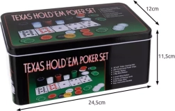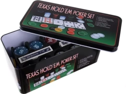 Set completo di poker TEXAS HOLD’EM in una pratica scatola metallica, comprende 200 gettoni con diversi valori, 2 mazzi di carte, un set di gettoni funzione (Dealer, Small Blind, Big Blind) e un tappetino da gioco verde. Il tutto è ordinatamente riposto in un portagettoni, che garantisce ordine e facile trasporto.