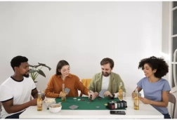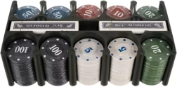 Tutto ciò che serve per un torneo in casa: 200 gettoni, 2 mazzi di carte, gettoni funzione e tappetino da gioco in un unico set portatile.