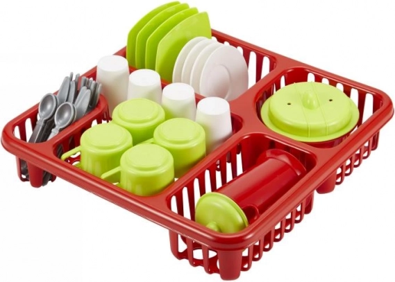Set divertente e pratico per la cucina dei bambini – il grande scolapiatti con stoviglie contiene tutto ciò di cui i piccoli cuochi hanno bisogno. I bambini allenano la motricità fine e vivono un’esperienza realistica di gioco domestico grazie a tazzine, posate, piatti e pentolini con coperchi.