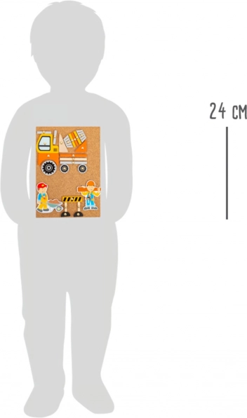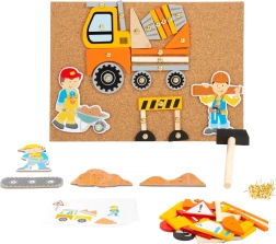 La bacheca in sughero con puntine consente di comporre e ricomporre più volte scene di trasporti e di cantiere secondo la fantasia dei bambini.