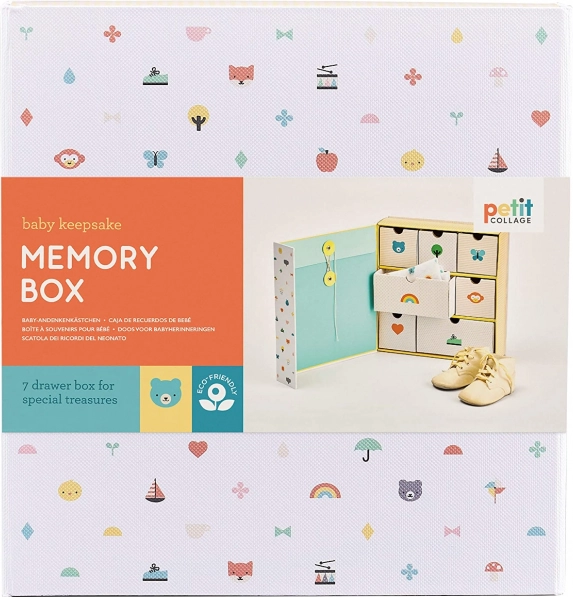 Una scatola dei ricordi elegante e ben progettata che aiuta a organizzare tutti gli attimi più preziosi dei primi mesi e anni del bambino. Grazie ai numerosi cassetti e alla tasca, potrai suddividere facilmente i piccoli oggetti e tornarci ogni volta con gioia. Il design minimal e giocoso con illustrazioni rende la scatola un bellissimo complemento per la cameretta.
