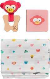 Elegante set regalo per neonati con motivo della scimmietta di PETIT COLLAGE, pensato con accessori pratici e rispetto per la natura. Include un massaggiagengive in legno di faggio FSC, un morbido fazzoletto in cotone biologico e un libricino illustrato in cartone. La confezione è completamente priva di plastica e i materiali provengono da fonti sostenibili.