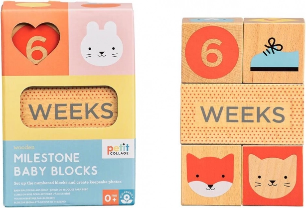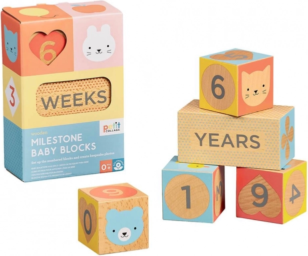 Eleganti cubi pietra miliare di Petit Collage per catturare i momenti più importanti del tuo bebè e della gravidanza. Il set in faggio certificato FSC offre stampe colorate, numeri e simboli per creare foto originali e chiare. Ideali per la nascita, i primi mesi e anni e per il servizio fotografico in gravidanza.