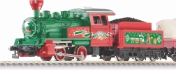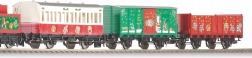 Locomotiva a vapore 0-4-0 con tender, carrozza passeggeri e due carri merci in un design festivo coordinato. Perfetto per creare subito la giusta atmosfera.