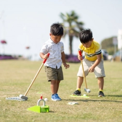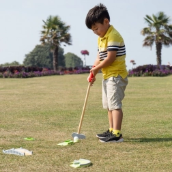 Diversi elementi e ostacoli da minigolf tengono i bambini in movimento e aiutano a migliorare precisione e strategia di gioco.
