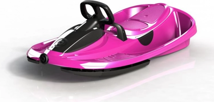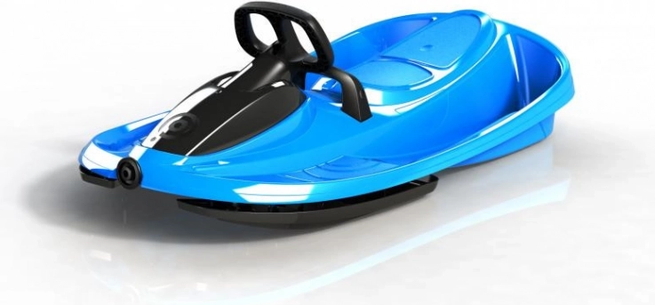 Slittino con volante STRATOS - struttura unica e robusta, la sterzata con differenziale aumenta la velocità in curva perché ogni sci può inclinarsi con un angolo diverso; meccanismo automatico di avvolgimento della corda di traino, due sedili, portata 90 kg, freno robusto con molla per il ritorno in posizione originale, nessun elemento metallico, nessun rischio di corrosione, certificazione di sicurezza per bambini.