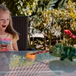 Il giocattolo consente il controllo dei movimenti avanti, indietro, sinistra e destra. La schiena del camaleonte può illuminarsi in cinque colori e i suoi occhi mobili, coda e lingua retrattile permettono un gioco interattivo – come ad esempio catturare gli insetti dai dischi di plastica inclusi. Questo giocattolo è una scelta eccellente per i bambini affascinati dalla tecnologia con elementi naturali.