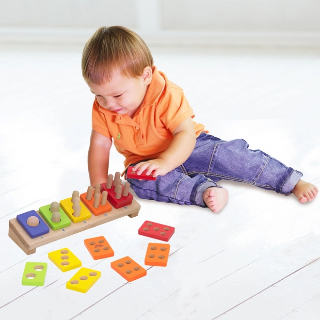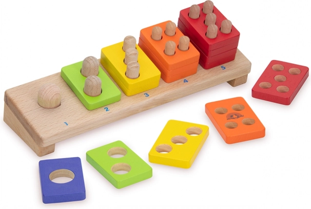Ogni tessera colorata ha un numero di fori corrispondente al numero sulla base. I bambini così esercitano in modo naturale i numeri 1–5 e il confronto delle quantità.