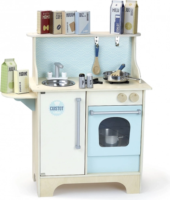 Questa cucina in legno blu VILAC Cuistot trasforma ogni cameretta in un piccolo studio di cucina. I bambini ameranno i dettagli realistici, come il fornello con manopole cliccabili, il lavello e il forno, e si divertiranno per ore con un set di accessori ricco e creativo.