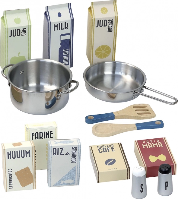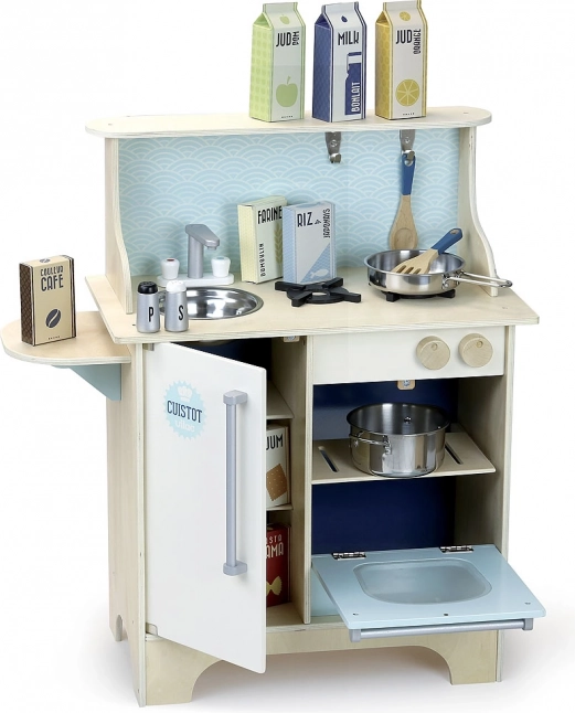 Grazie alla struttura in legno robusta, la cucina è stabile e resistente. Include cappello e grembiule da chef, saliera e pepiera, cucchiaio di legno, pentola, padella e alimenti in cartoni tetrapak: tutto pronto per cucinare con la fantasia. È richiesta una semplice assemblaggio dopo l’apertura.