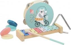La confezione contiene tutto il necessario per una piccola orchestra domestica: xilofono colorato con bacchetta, tamburello con orsetto, triangolo dal suono chiaro e un paio di comode nacchere. Grazie al design ergonomico, gli strumenti si impugnano bene dalle manine e motivano i bambini al gioco musicale.